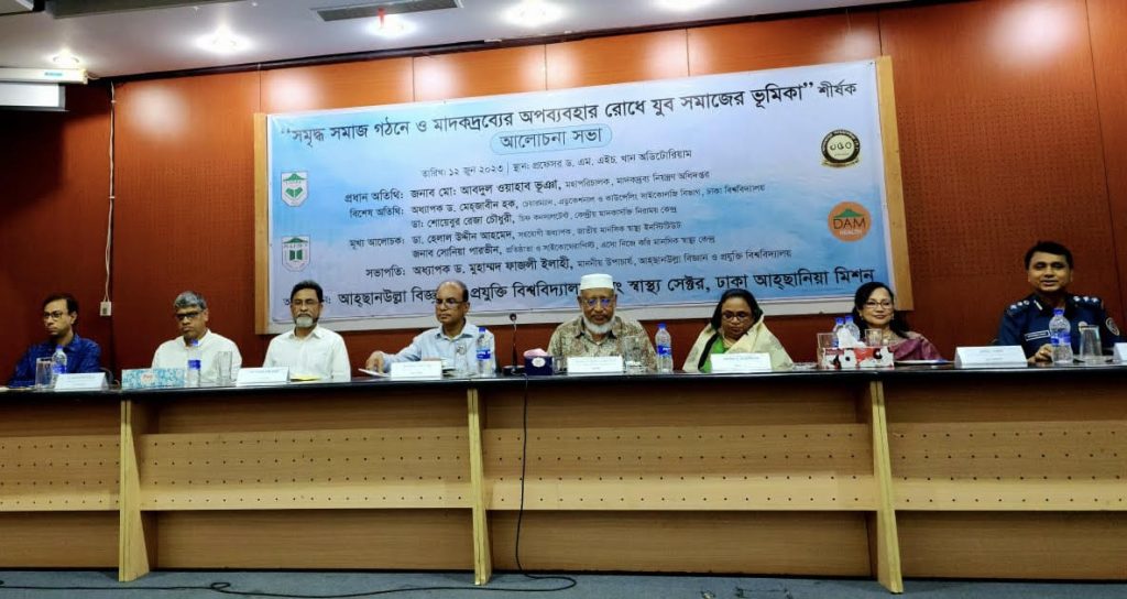 Youth is the time for our brains to grow and develop. Using substances at a young age affects brain development processes. It can also calibrate their decisions. As a result, they are more likely to engage in antisocial activities including substance use. The earlier young people start using substances, the more likely they are to become substance dependent later in life. So young society should be involved in activities for preventing substance use. In addition, the involvement of families, educational institutions, society and media in substance prevention programs can play a role in substance use reduction. Director General of the Department of Narcotics Control Abdul Wahab Bhuya said this in his speech as the chief guest at the discussion meeting organized by Ahsanullah University of Science and Technology and Dhaka Ahsania Mission Health Sector’s joint initiative on 12 June 2023, at the Dr M. H. Khan auditorium of Ahsanullah Science and Technology University titled “Role of youth in building an affluent society and curbing substance use” on the occasion of the International Day Against Drug Abuse and Illicit Trafficking 2023. He also said people who use substances, especially those struggling with addiction, face stigma & discrimination to get support. That is why we need to be compassionate and caring towards those who are dependent on substances so that they can return to a healthy and normal life. This is why this year the United Nations Office on Drugs and Crime (UNODC) has set the theme for the International Drug Day as “People first: stop stigma and discrimination, strengthen prevention”.