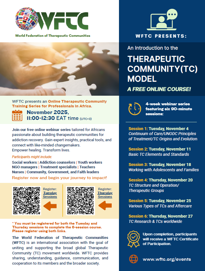 On November 4th, the World Federation of Therapeutic Communities (WFTC) launches the free online course tailored for Africans passionate about building therapeutic communities for addiction recovery. The course, including six 90-minute sessions, will be incredibly valuable in gaining insights, practical tools, and connections. Scan the QR code on the flyer to register!