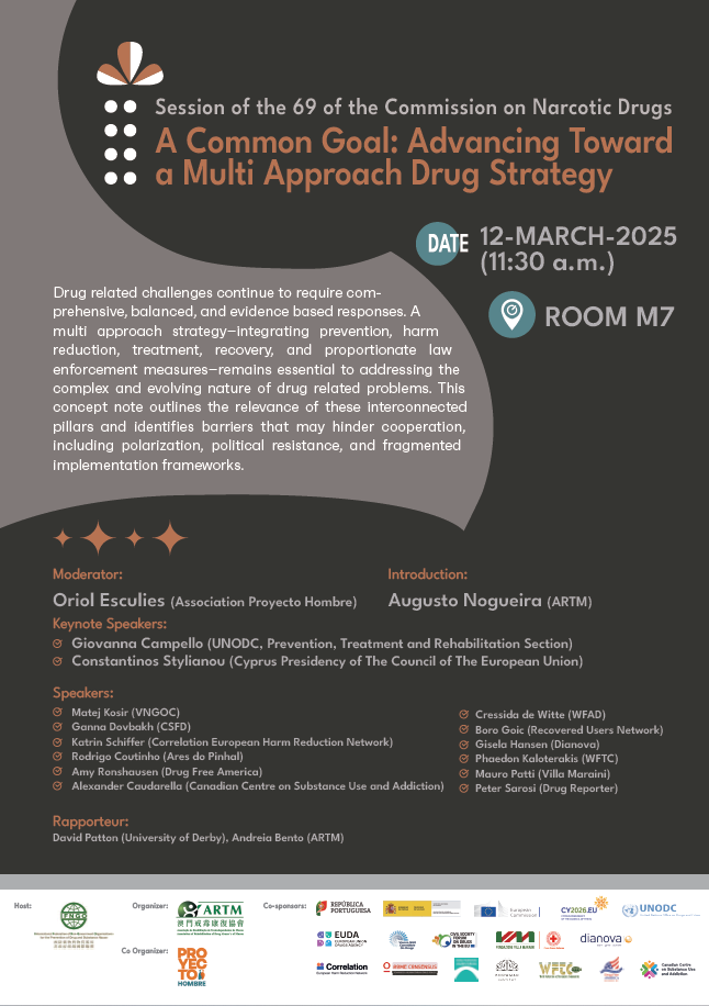 Organised by the International Federation of Non-Governmental Organizations for the Prevention of Drug and Substance Abuse with the support of Portugal, the European Union, the UNODC Prevention, Treatment and Rehabilitation Section, Ares do Pinha, the Association of Rehabilitation of Drug Abusers of Macau (ARTM), the Correlation – European Harm Reduction Network, Dianova International, the Drug Free America Foundation, Drug Reporter, the European Union Civil Society Forum on Drugs, the European Union Drugs Agency, Knowmad Institut, Proyecto Hombre, the Recovered Users Network (RUN), the Rome Consensus 2.0 Alliance, the Vienna NGO Committee on Drugs, the Villa Maraini Foundation, the World Federation Against Drugs and the World Federation of Therapeutic Communities.