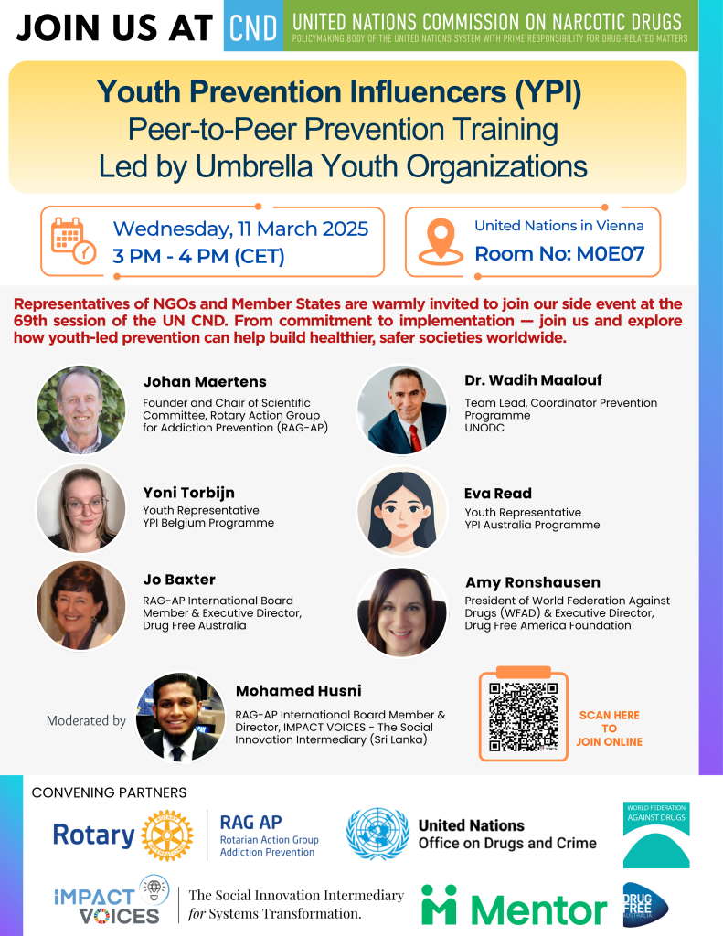 Organised by the Rotarian Action Group Addiction Prevention with the support of the UNODC Crime Prevention and Criminal Justice Section, Drug free Australia, Impact Voices – The Social Innovation Intermediary, Mentor Sweden and the World Federation Against Drugs