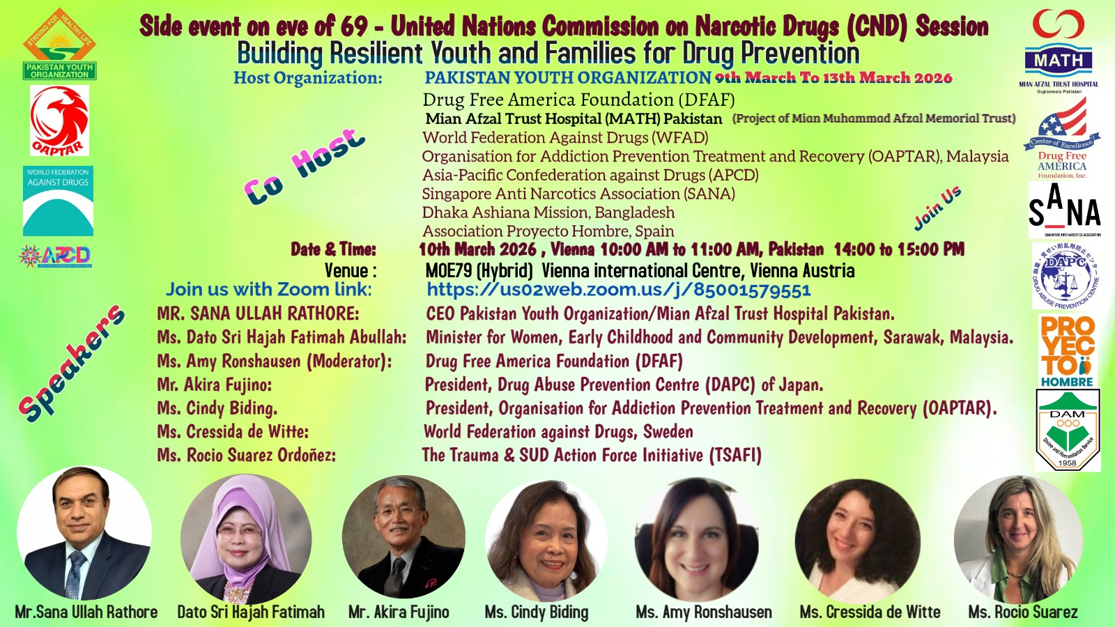 Organised by the Fourth Wave Foundation with the support of the UNODC Prevention, Treatment and Rehabilitation Section, the Asia-Pacific Confederation against Drugs, Association Proyecto Hombre, Carlton Hall Consultancy LLC, the Dalgarno Institute, the Drug Free America Foundation, Movendi International, the San Patrignano Foundation, the Singapore Anti-Narcotics Association, the Slum Child Foundation, Smart Approaches to Marijuana, the Turkish Green Crescent Society, the Uganda Youth Development Link, the Vienna NGO Committee on Drugs and the World Federation Against Drugs
