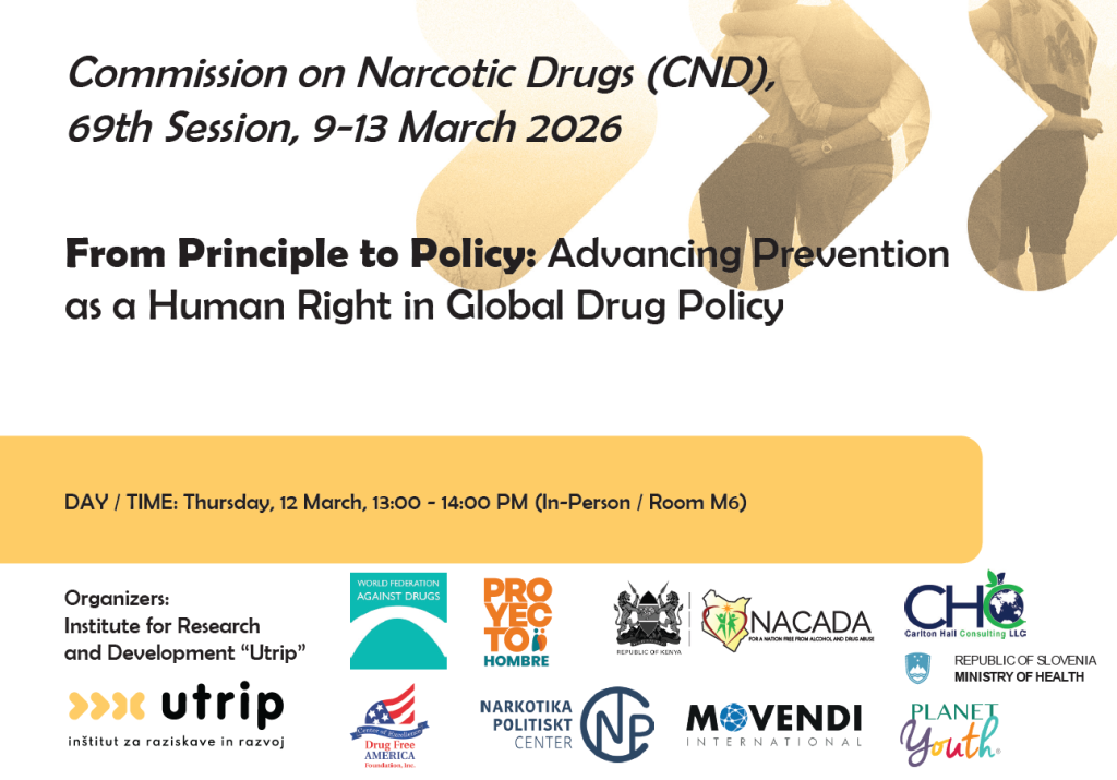 Organised by the Institute for Research and Development “Utrip” with the support of Kenya, Slovenia, Association Proyecto Hombre, Carlton Hall Consulting LLC, the Drug Free America Foundation, the Drug Policy Centre Sweden, Movendi International, Planet Youth and the World Federation Against Drugs