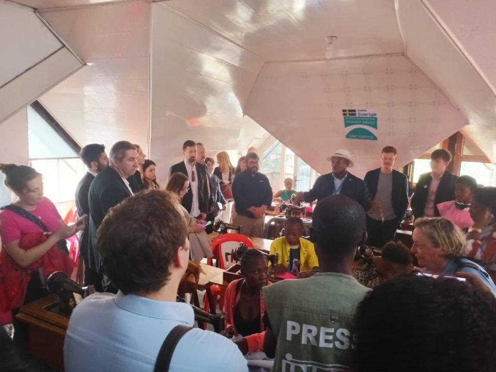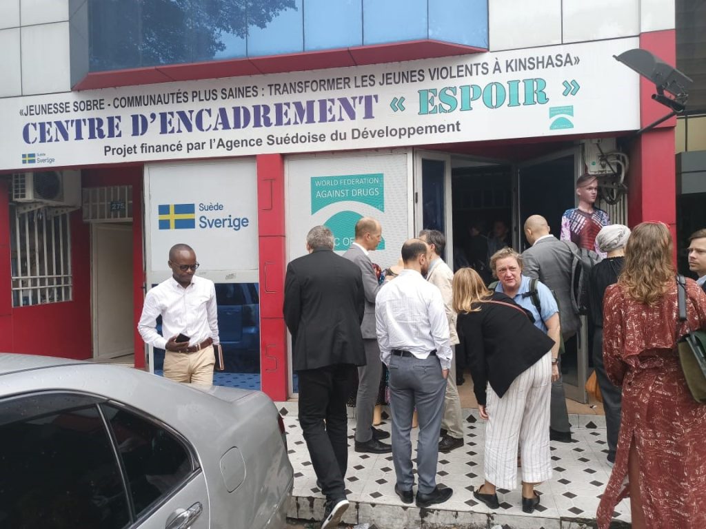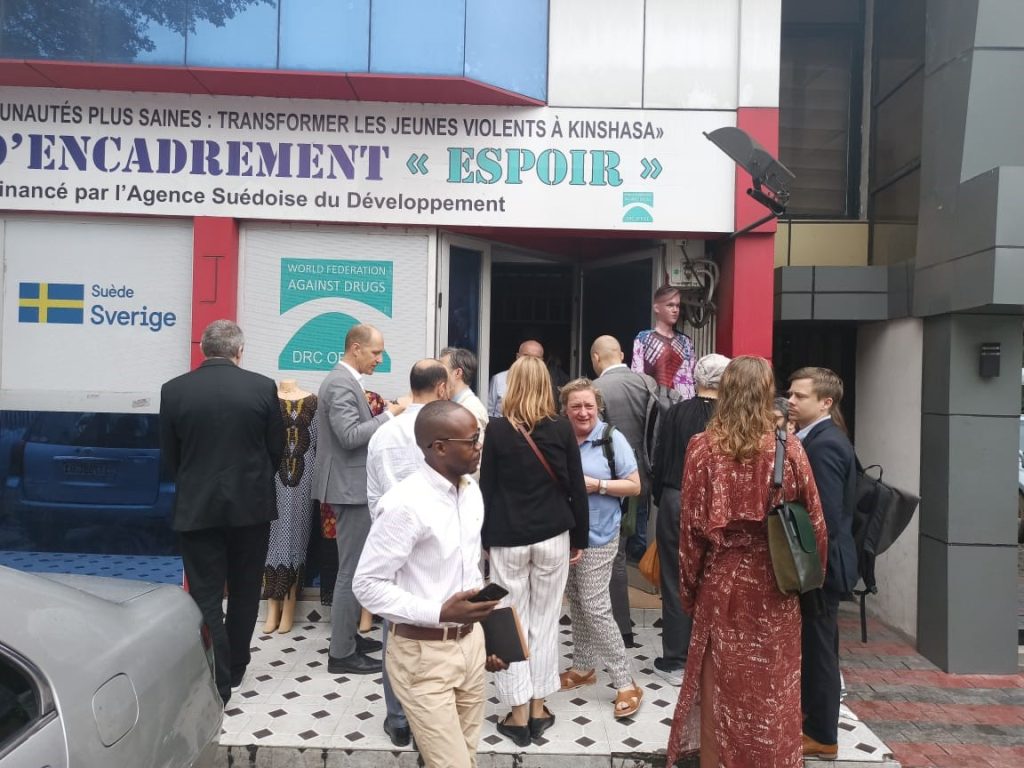 Today, March 10, 2023, the WFAD office in the DRC had the privilege and honour to welcome an important delegation, composed of the COAFR and ACP, visiting the DRC and the Swedish Embassy in DRC. The delegation was headed by HE Henric Rasbrant, Ambassador of Sweden in DRC along with Mr Joachim Beijmo, Head of Cooperation, Ms Charlotte Mukadi, National Programme Officer, and Ms Cornelia Gårdmark, Head of Political, Economic, Promotion, and Communication Section of the Swedish Embassy in Kinshasa, carried out a field visit. The field visit showcased the activities of the project Sober Youth-Healthier Communities: Transforming Violent Youth in Kinshasa funded by the Swedish Cooperation in DRC.